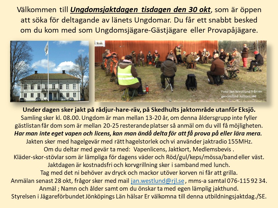 Välkommen till Ungdomsjaktdagen tisdagen den 30 okt, som är öppen att söka för deltagande av länets Ungdomar.