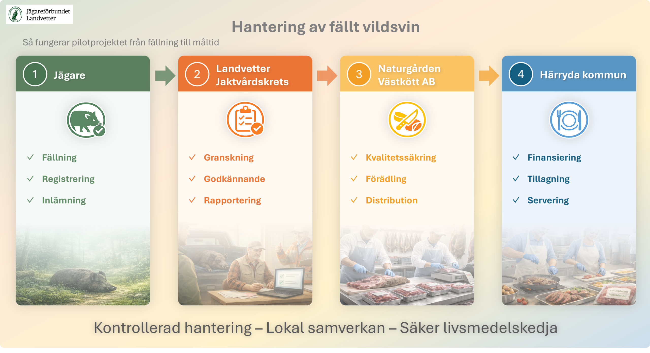 Fokus ligger på ansvarsfull vildsvinsförvaltning, god jaktetik och att ta tillvara köttet lokalt genom en tydlig och kontrollerad kedja.