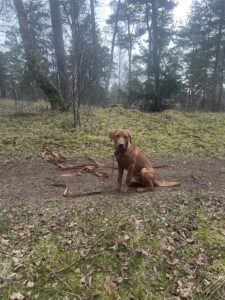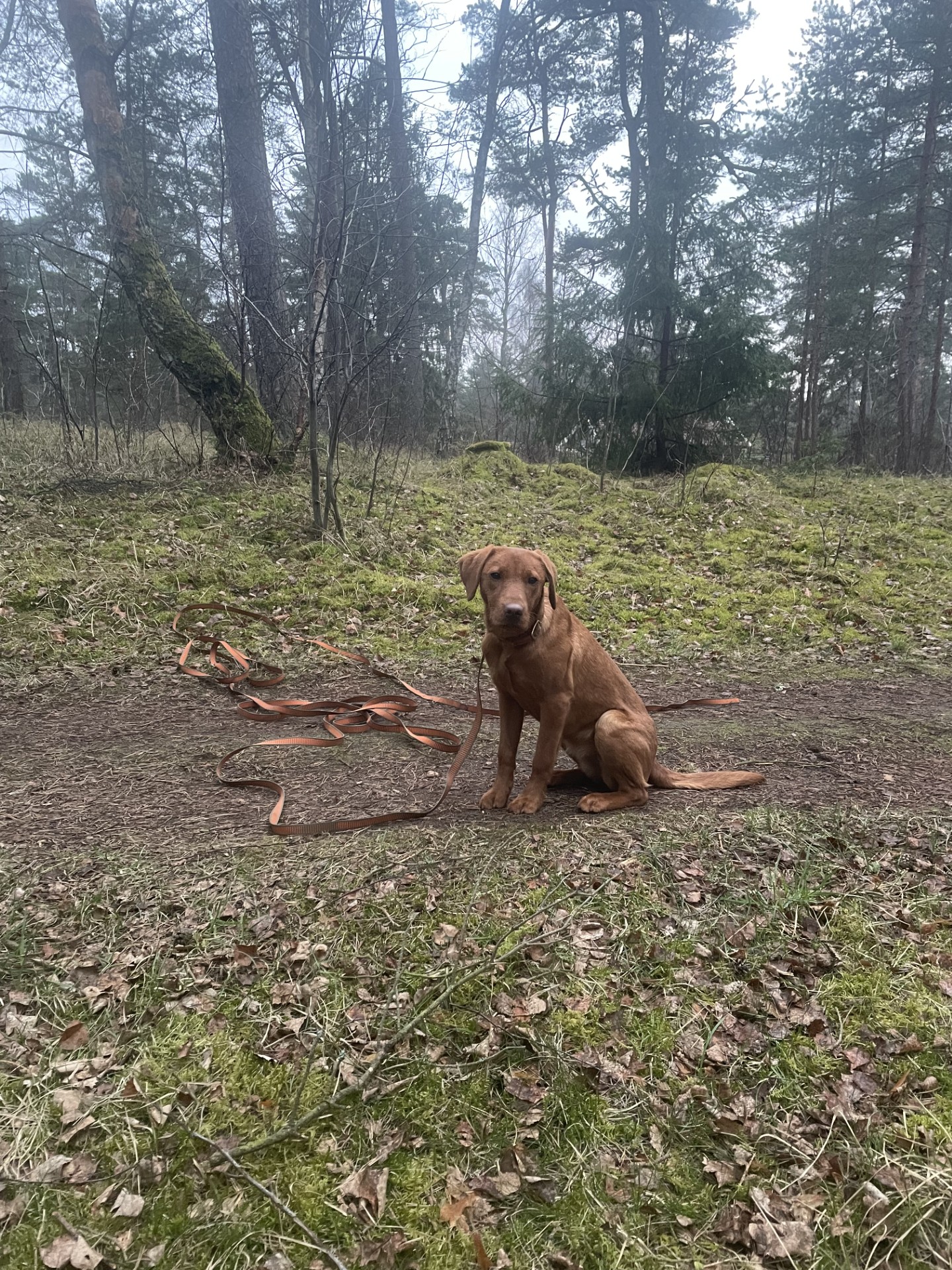 Vi brukar ha tur med vädret på våra hundkurser i Ystad, så även ikväll även om regnet hängde i luften. Den fuktiga terrängen gjorde att förutsättningarna för spårning var gynnsamma. Det märktes också när den parvisa avrapporteringen av spårningen genomfördes. Alla hade utan större problem tagit sig fram till den ”hägrande klöven”. Hundarna såg också nöjda ut när de med klöven i munnen anlände för avrapportering.