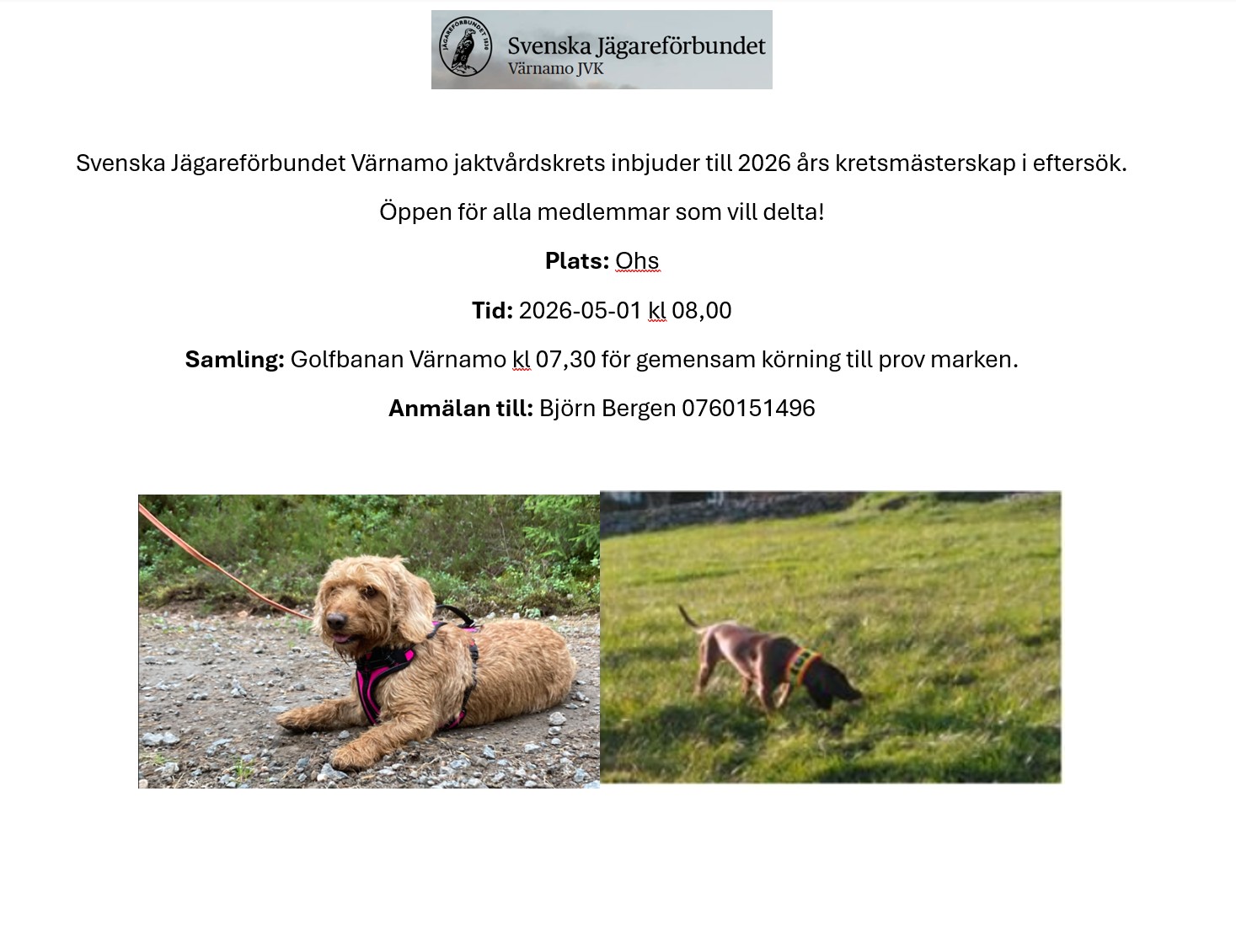 Kretsmästerskap i eftersök Av varnamojvk den 1 maj, 2026 i Karta Otillgänglig Datum/Tid Date(s) - 2026-05-0108:00 - 14:00 Kategorier Kretsmästerskap Värnamo Jaktvårdskrets